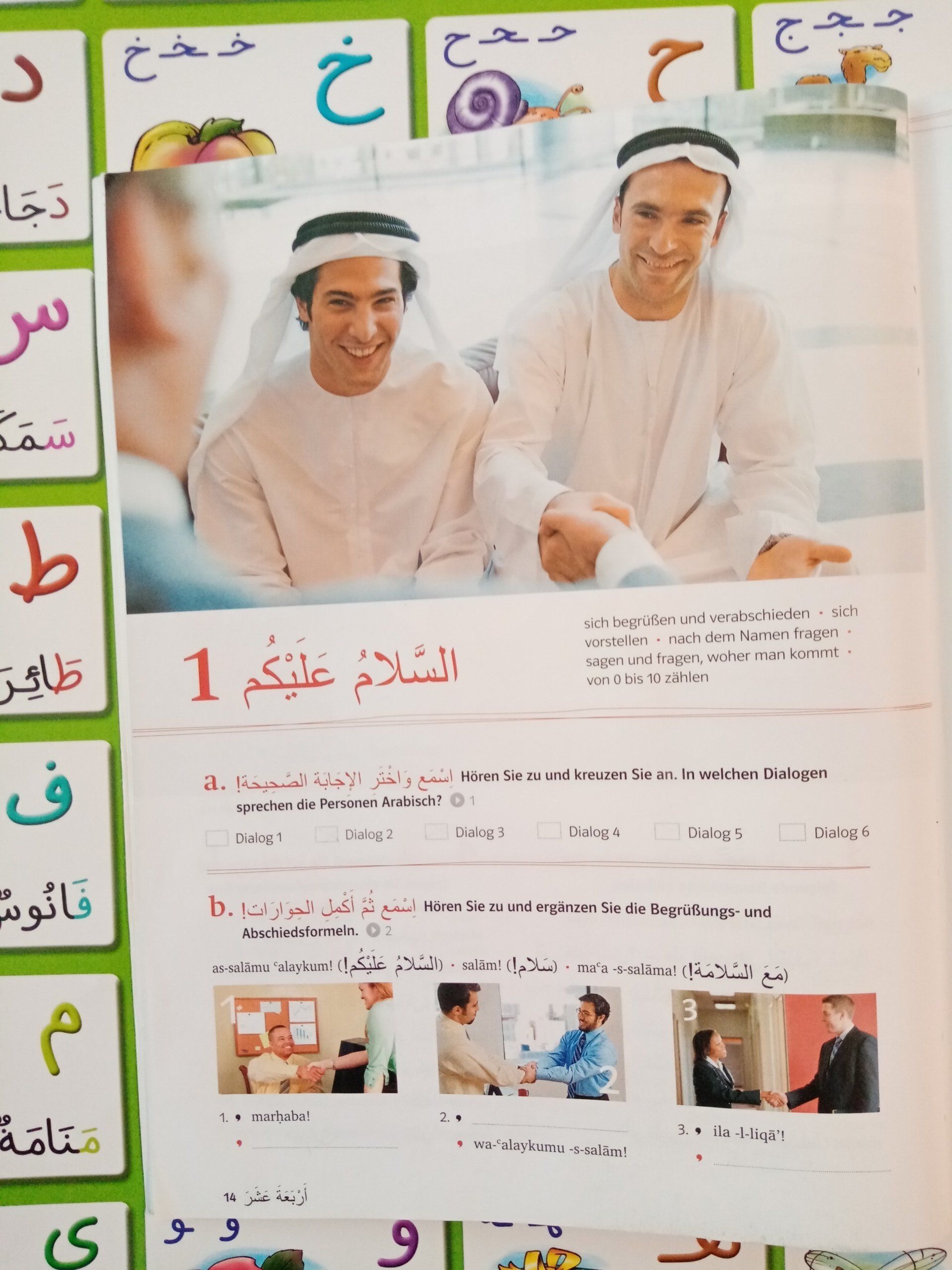 - •Previous knowledge: None •Course duration: 15 x 60 min •Teaching materials: Lessons 1 to 3 of the Arabic textbook Salam! new A1-A2 free additional materials are provided by the Aladin Institute during the course. •Learning objectives: •The Arabic alphabet: approximately 3 letters per course session. The alphabet consists of 28 letters. •Speaking intentions: Using phonetic transcription from the first lesson! After this course, thanks to the Aladin teaching method©, participants will be able to read Arabic fluently, greet and say goodbye, introduce themselves, ask for and state their name, say and ask where they are from, count to 10, ask how they are, say thank you, apologize, introduce someone, make a phone call, ask for and state their nationality, ask about language skills and state their knowledge, and name objects in their surroundings.•Grammar: sentence structure in Arabic, nominal and verbal clauses, personal pronouns, possessive pronouns in the singular, question words, prepositions, feminine declension of adjectives and nouns, conjugation of some verbs in the present tense with singular personal pronouns, logic of the Arabic language.