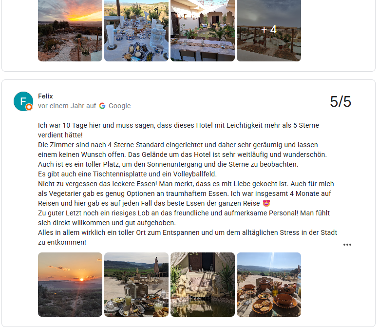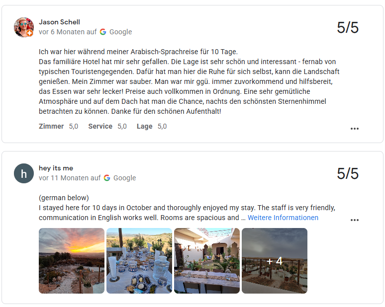 | Voyage linguistique arabe en Tunisie en avril | 7 jours : 01.04. - 08.04.2025 | 3 à 8 participants | a lieu, il ne reste que quelques places | Pension complète à l'hôtel 👑1001-Nights Palace👑 | Cours d'arabe communicatif (10 x 60 minutes) comprenant 1 heure de formation interculturelle excursions à Tunis, Sidi Bousaid, El Kef, Tabarka, hammam authentique, mosquée, musée, visites de fermes cours de cuisine & bien plus encore... | à partir de 1 090 € |