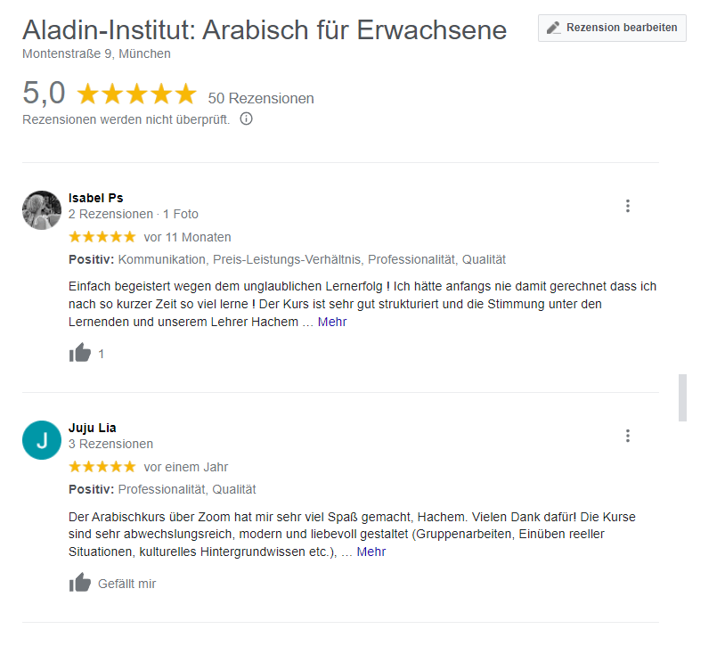 7. Concept d'enseignement structuré avec la méthode d'enseignement révolutionnaire Aladin©À l'Institut Aladin, la structure avant tout ! Cela s'applique non seulement à l'ensemble du concept d'enseignement et aux niveaux d'apprentissage précisément définis en fonction des sujets et des objectifs d'apprentissage, mais aussi au contenu du cours lui-même, par exemple, pour les débutants, la mise à niveau des lettres individuelles aux mots, aux phrases et enfin au texte et pour les apprenants avancés, la grammaire, la conjugaison des verbes, les radicaux dérivés, la structure des phrases… Ceci accélère le processus d'apprentissage et vous permet d'apprendre des structures grammaticales encore plus complexes en un rien de temps et Toi ainsi exprimer plus en détail pouvoir.